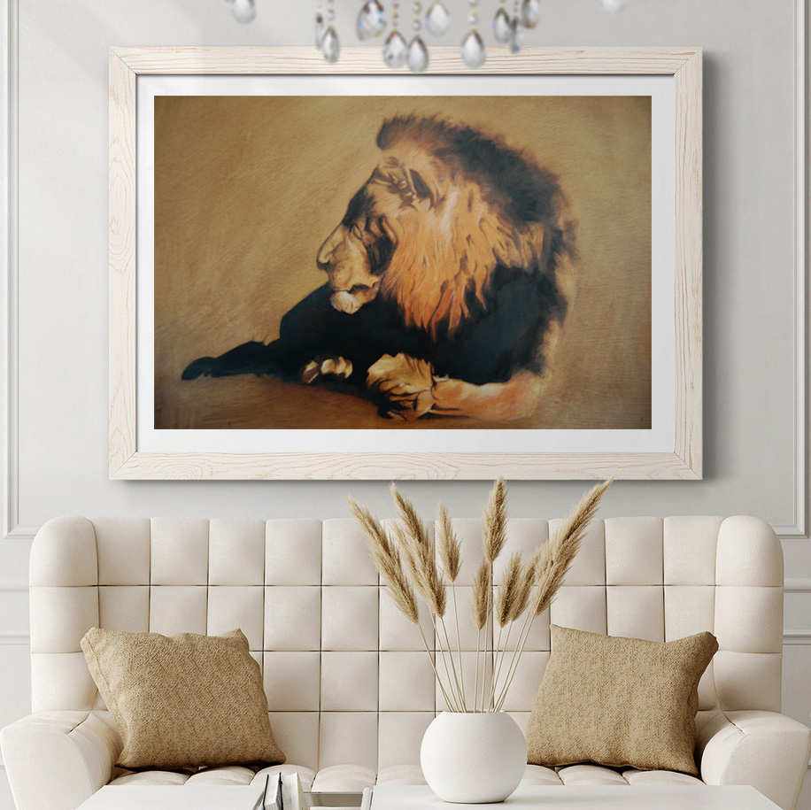 Experience the regal charm and mesmerizing aura of the lion. This painting of the lion is a captivating piece that beautifully captures the majestic nature of the king of the jungle. From the intense gaze to the intricate patterns in the fur, every element is meticulously captured to showcase the feline’s majesty. With intricate details and vibrant colors, this artwork showcases the strength and grace of this powerful feline. Displaying the iconic features of this feline species, this art piece embodies grace, strength, and dominance. Whether displayed in a living room, bedroom, or office, it will instantly become the focal point of the room. The lion has long been a symbol of courage and leadership, making this artwork a meaningful addition to any room. Bring the wild spirit of the lion into your home with this captivating lion painting. Immerse yourself in the beauty of the natural world and experience the awe-inspiring presence of this regal animal.